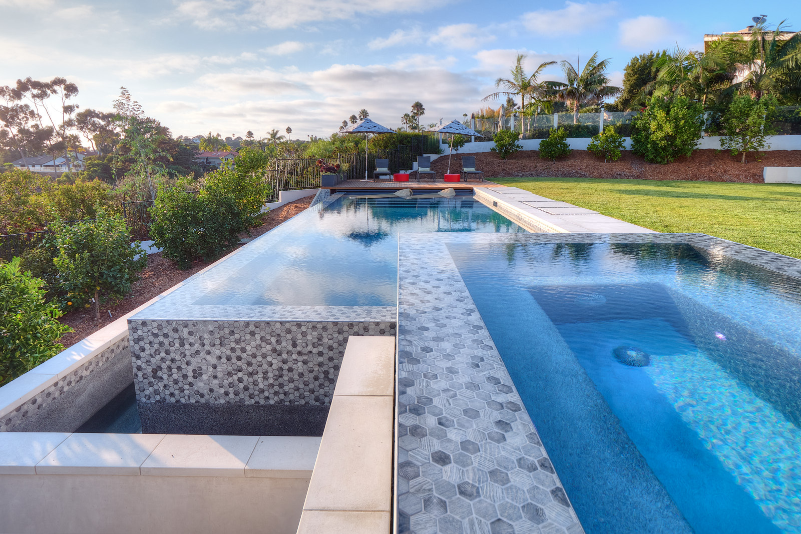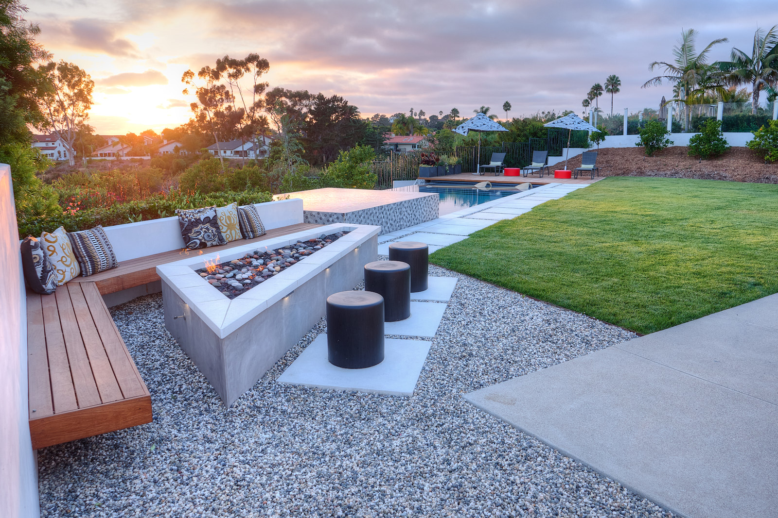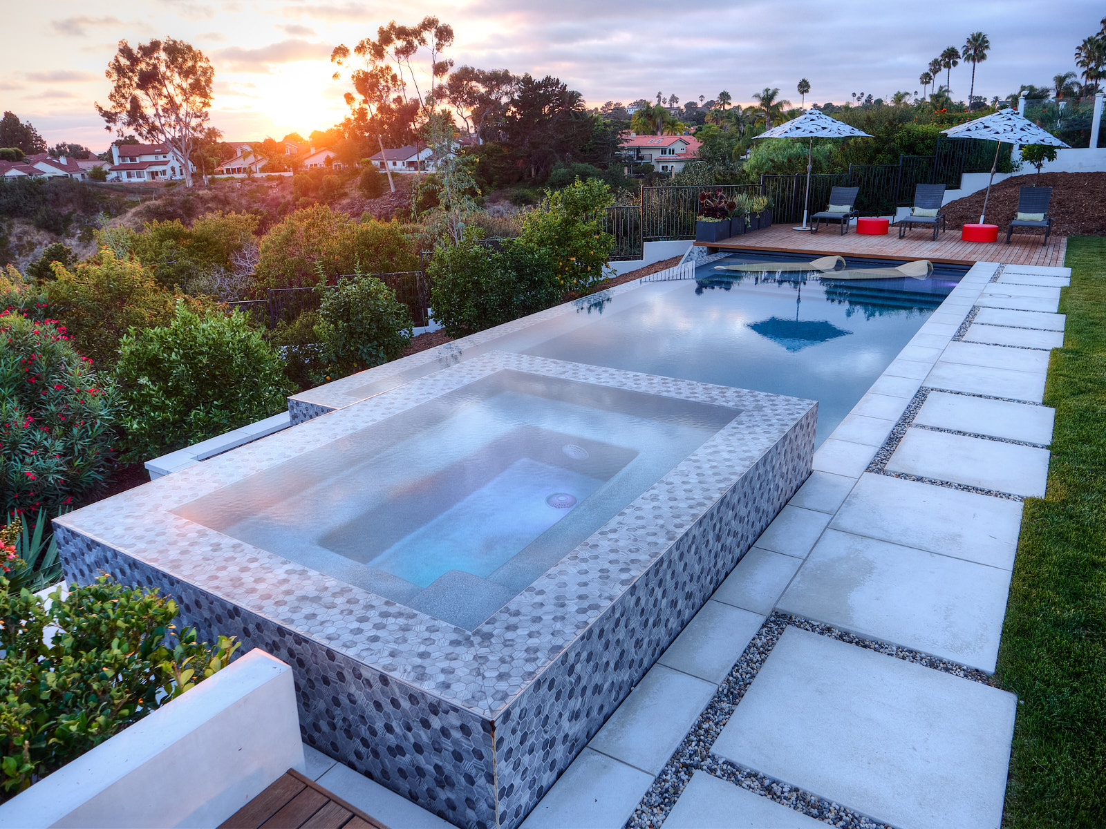 This remodel of both the front and back yard included a new, custom vanishing pool and spa with automatic cover, Ipe decking over pool cover, custom fire pit, PV and water solar panel installation, hardscape, fencing, custom color lighting. The landscaping work included subterranean irrigation for grass area, to make this lawn lush and low maintenance.