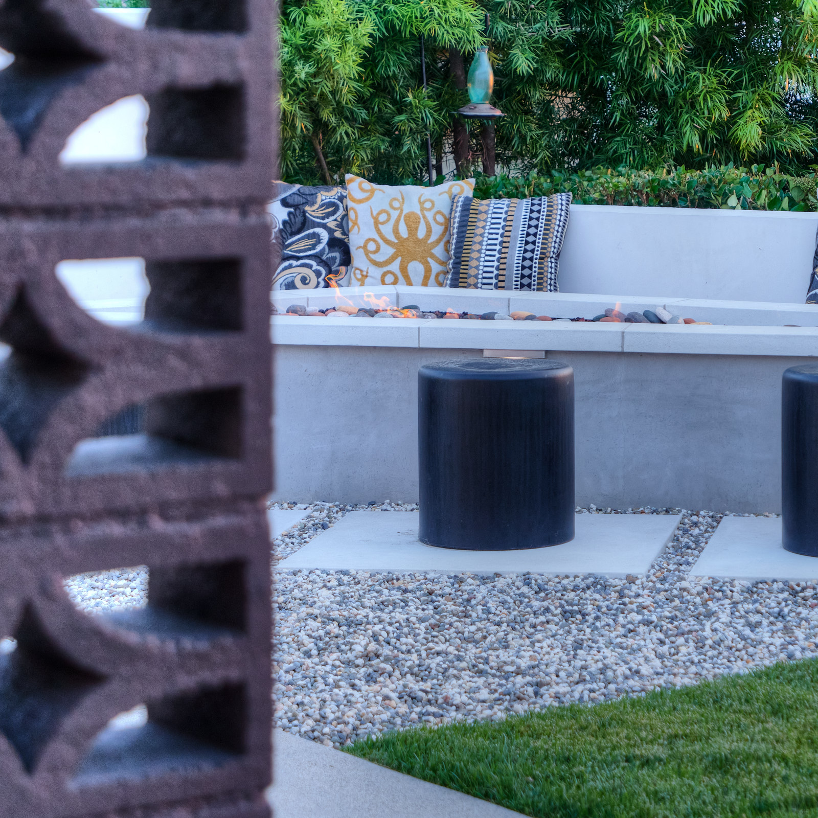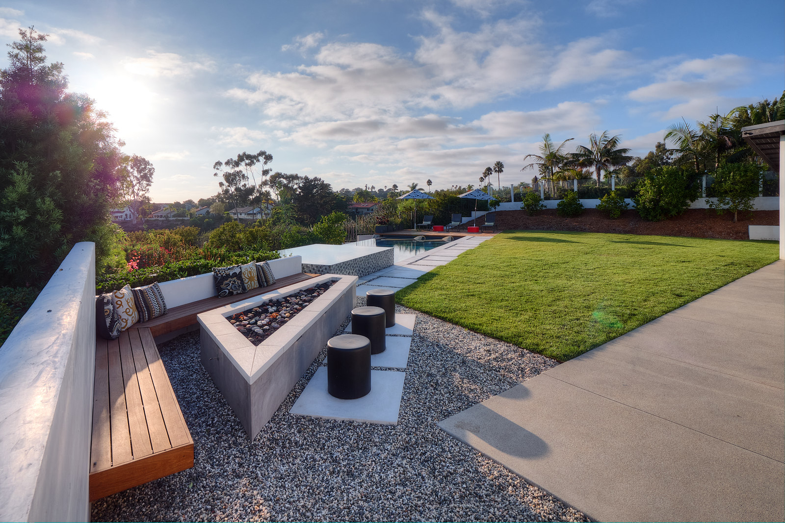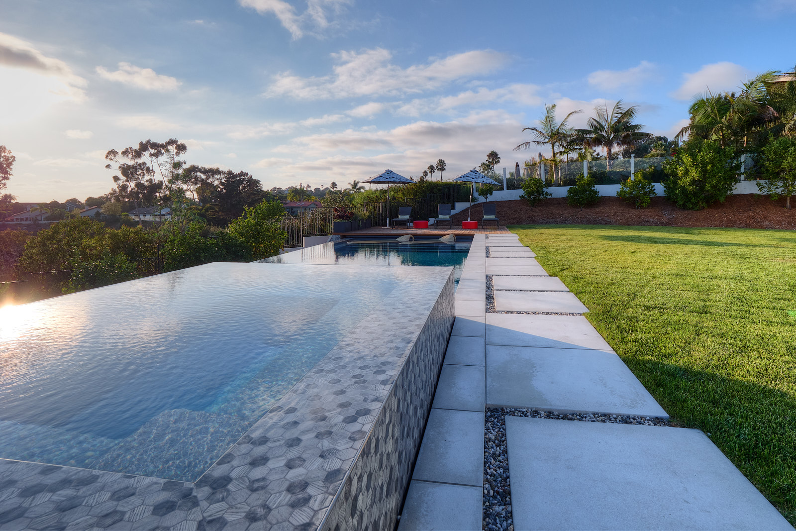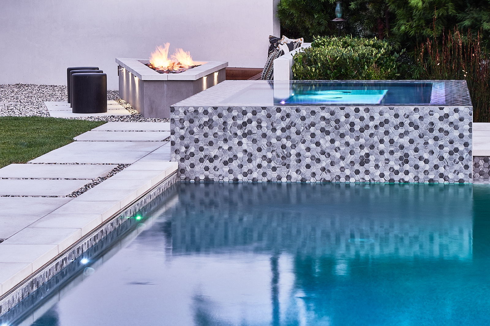 This remodel of both the front and back yard included a new, custom vanishing pool and spa with automatic cover, Ipe decking over pool cover, custom fire pit, PV and water solar panel installation, hardscape, fencing, custom color lighting. The landscaping work included subterranean irrigation for grass area, to make this lawn lush and low maintenance.