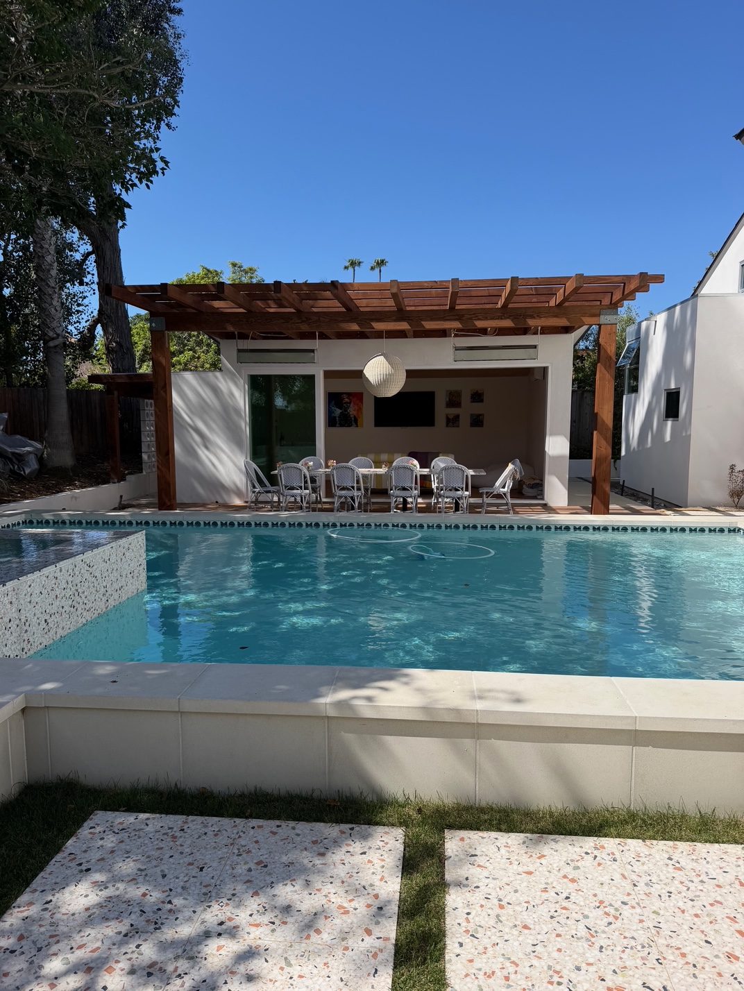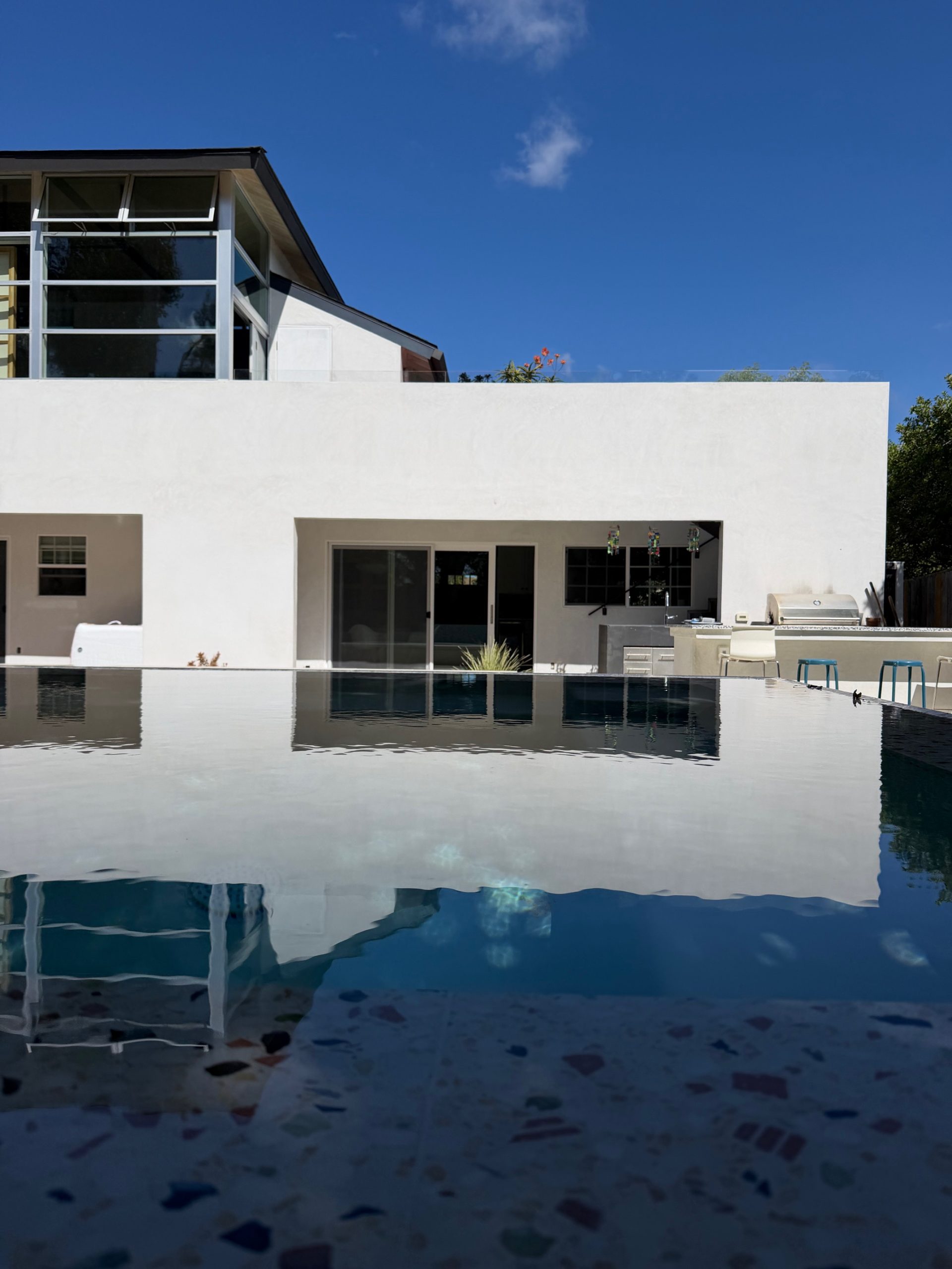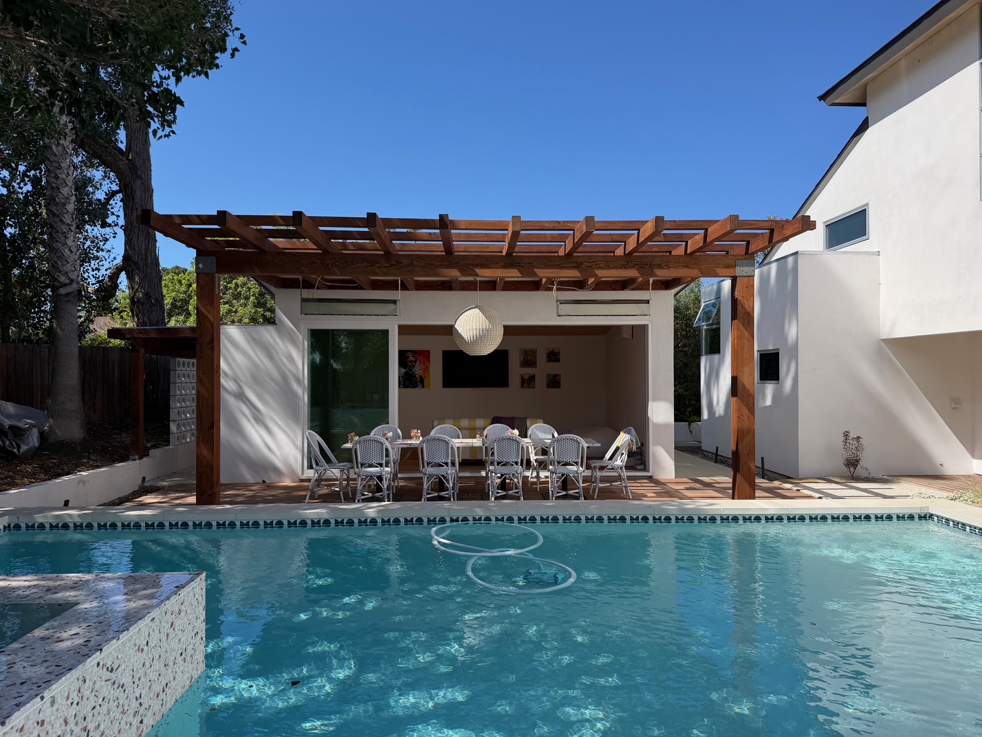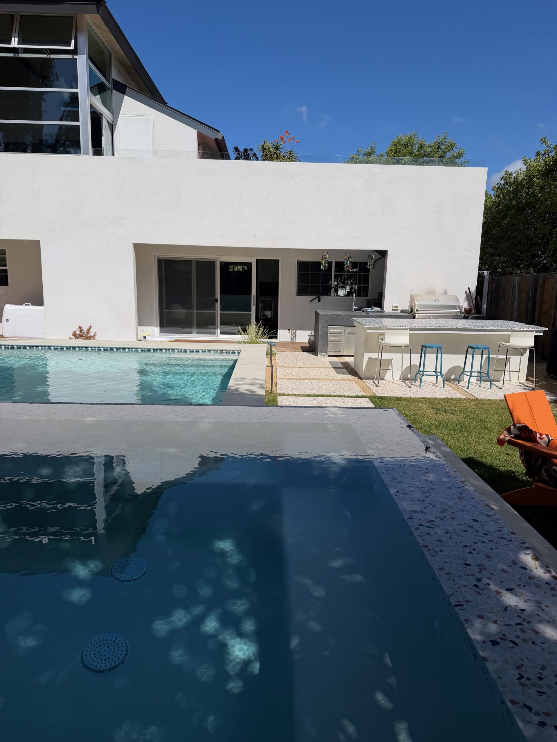We remodeled this backyard with a custom pool,spa, and ADU that serves as a poolhouse. The clients were in process of pulling a permit for a 350 sq ft second story addition and also wanted a pool and spa. We recommended building a 350 sq ft ADU with an outdoor bathroom and shower which would save them money and be less intrusive to their living area. We also built an island for the existing BBQ for more entertaining areas. Due to the large sliding glass door on the ADU and the lack of light coming into the home facing the pool and ADU, we replaced french doors with new larger sliding glass doors.