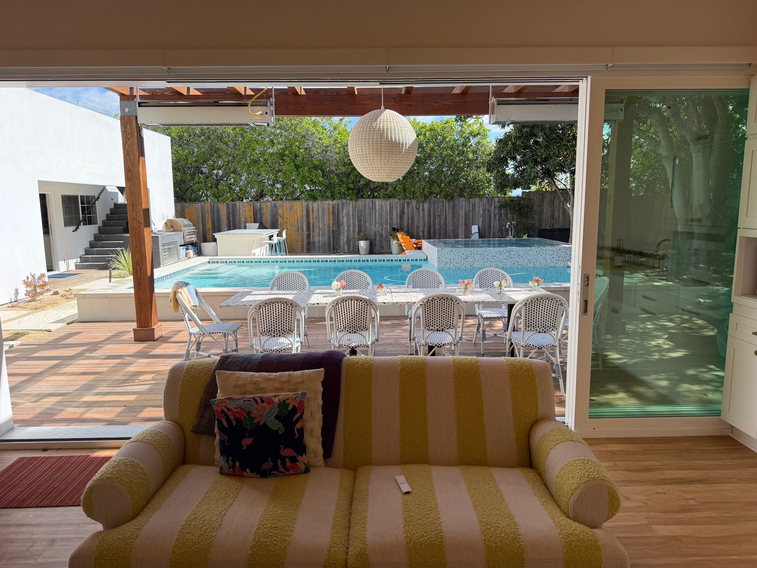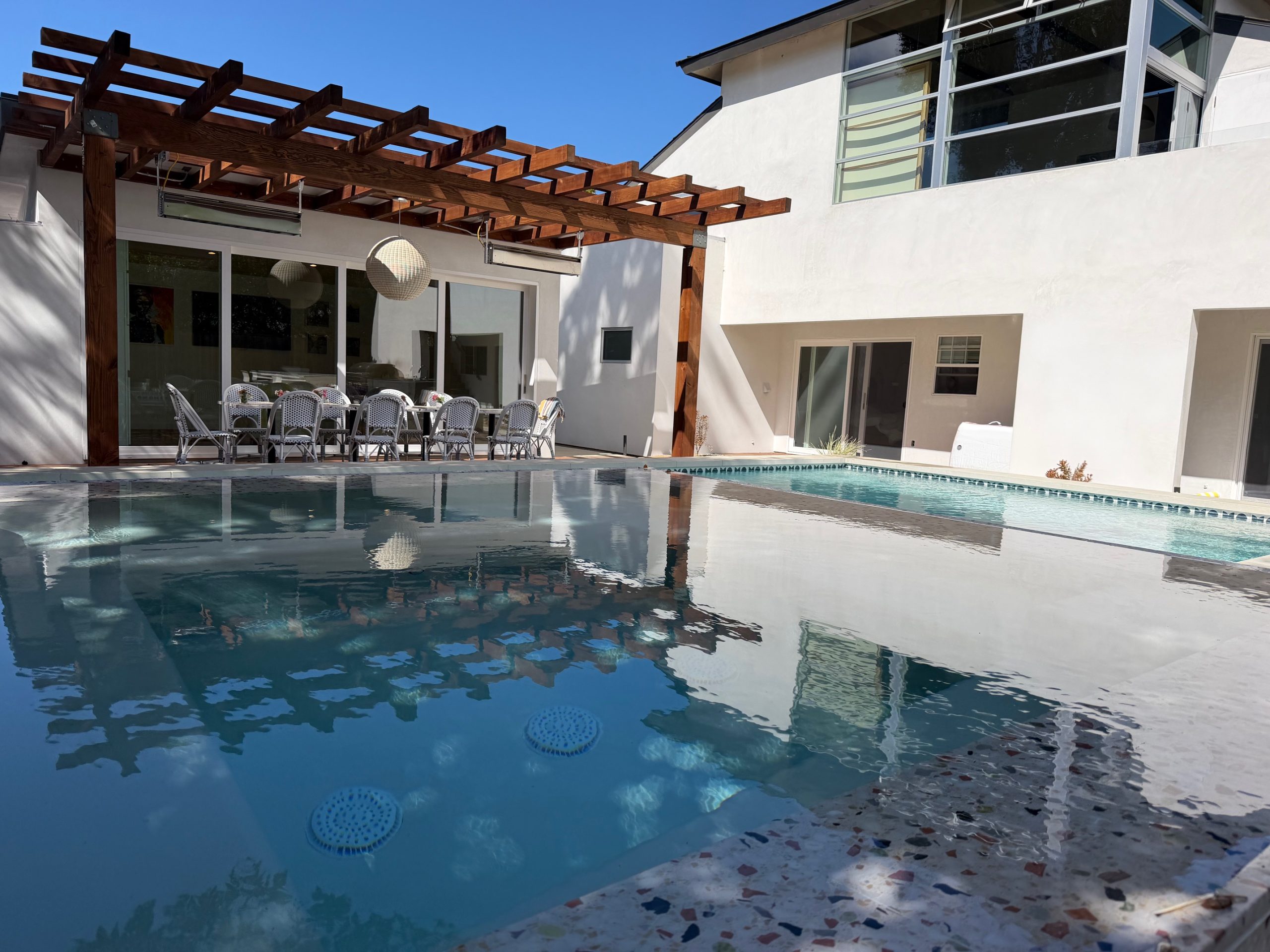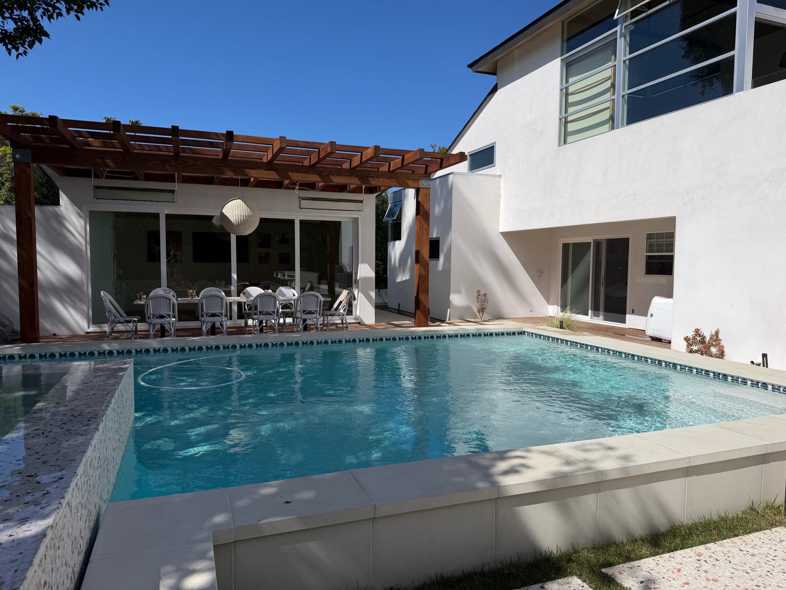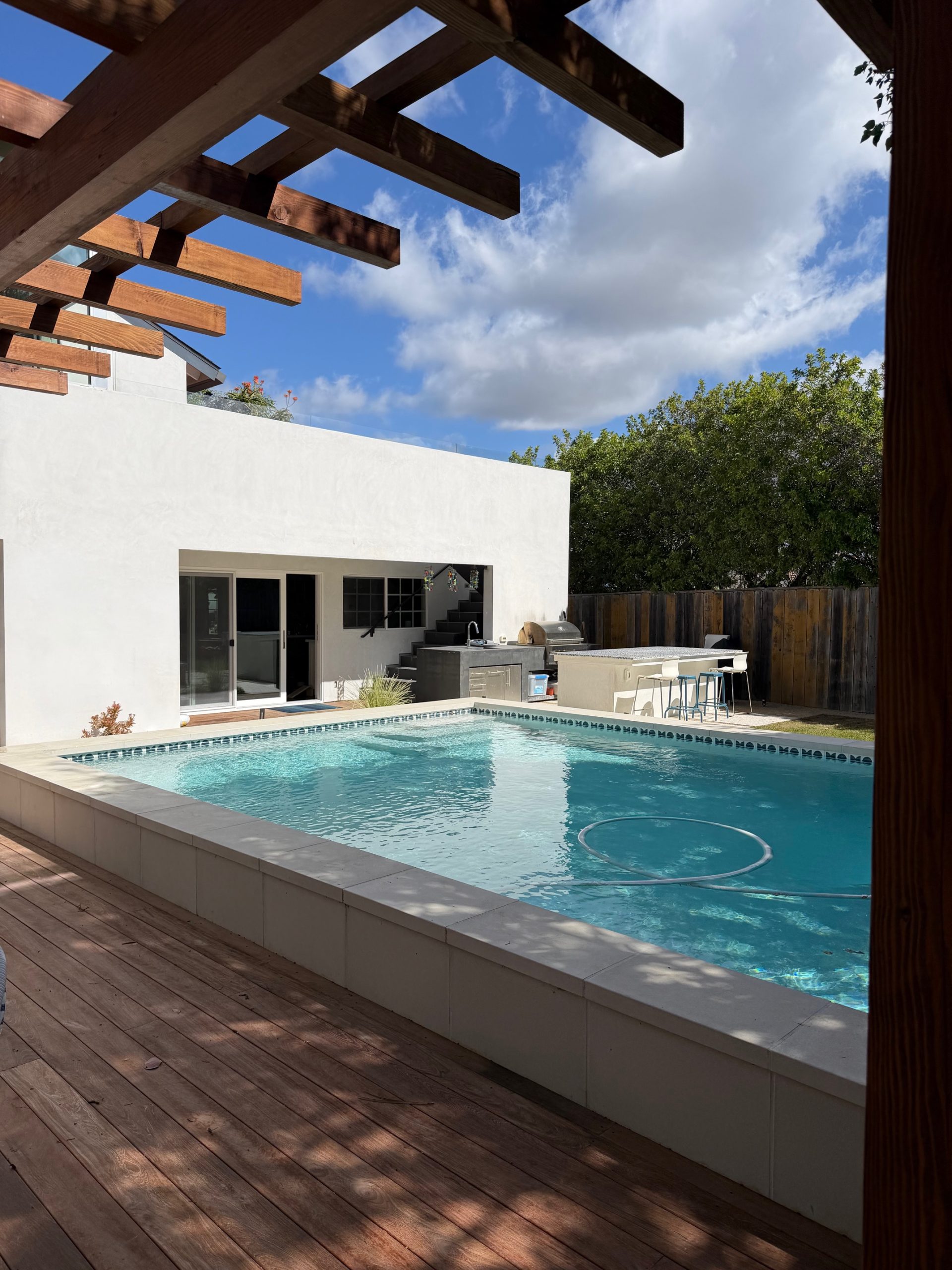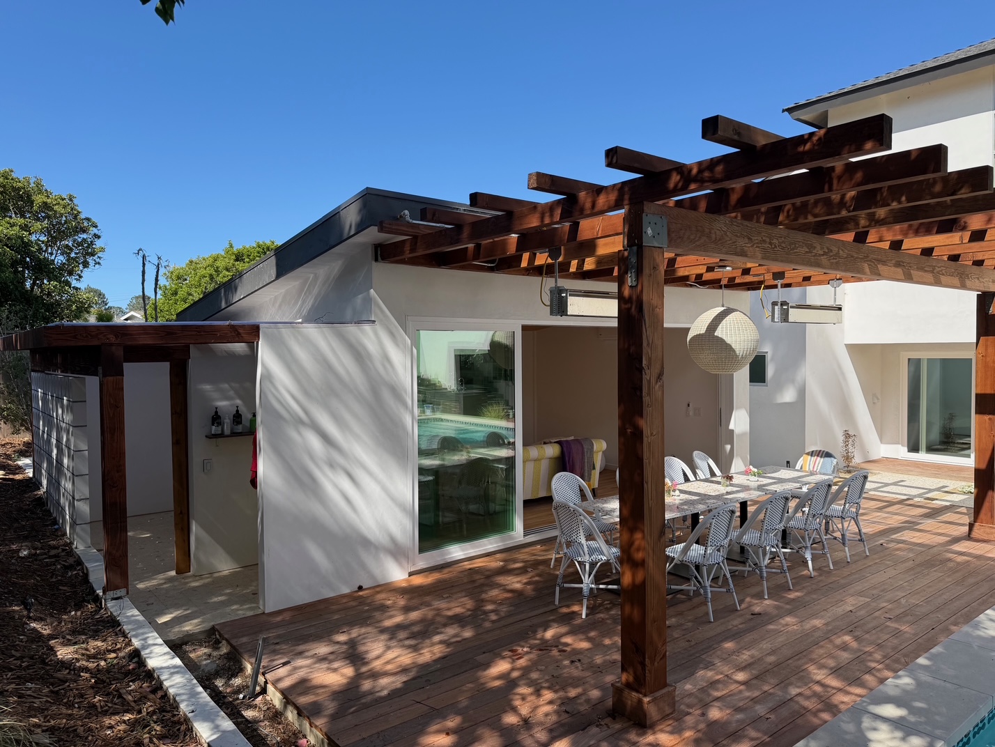 We remodeled this backyard with a custom pool,spa, and ADU that serves as a poolhouse. The clients were in process of pulling a permit for a 350 sq ft second story addition and also wanted a pool and spa. We recommended building a 350 sq ft ADU with an outdoor bathroom and shower which would save them money and be less intrusive to their living area. We also built an island for the existing BBQ for more entertaining areas. Due to the large sliding glass door on the ADU and the lack of light coming into the home facing the pool and ADU, we replaced french doors with new larger sliding glass doors.