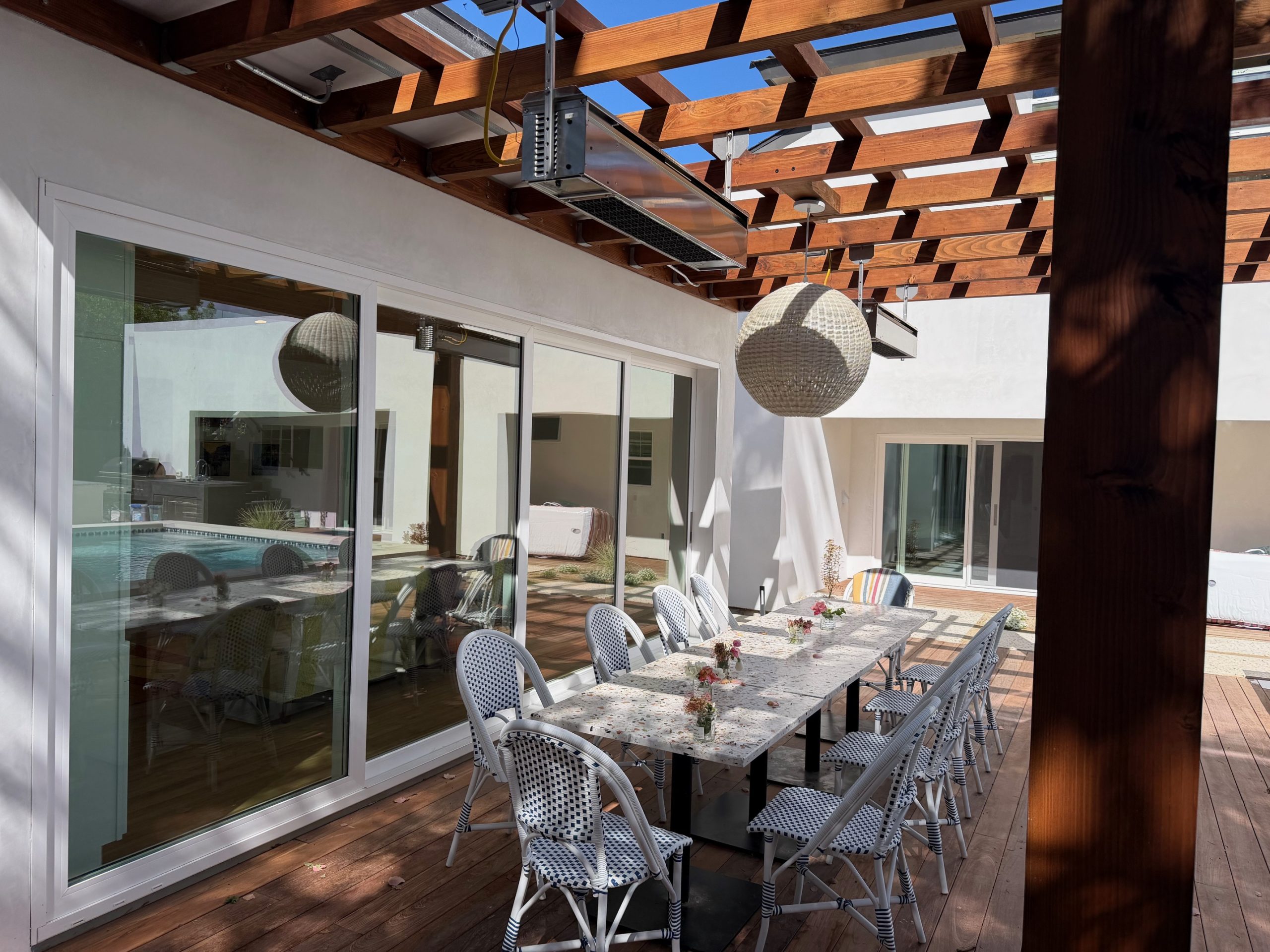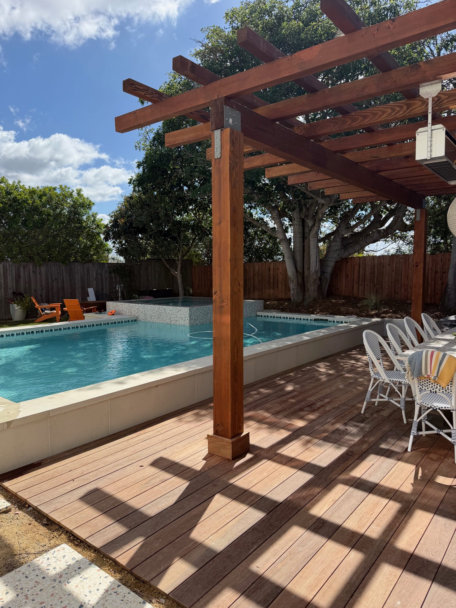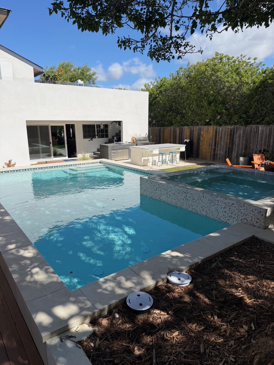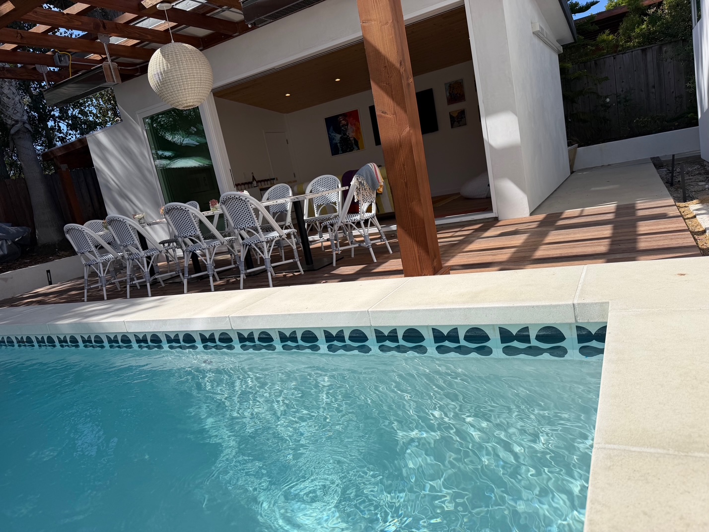 We remodeled this backyard with a custom pool,spa, and ADU that serves as a poolhouse. The clients were in process of pulling a permit for a 350 sq ft second story addition and also wanted a pool and spa. We recommended building a 350 sq ft ADU with an outdoor bathroom and shower which would save them money and be less intrusive to their living area. We also built an island for the existing BBQ for more entertaining areas. Due to the large sliding glass door on the ADU and the lack of light coming into the home facing the pool and ADU, we replaced french doors with new larger sliding glass doors.