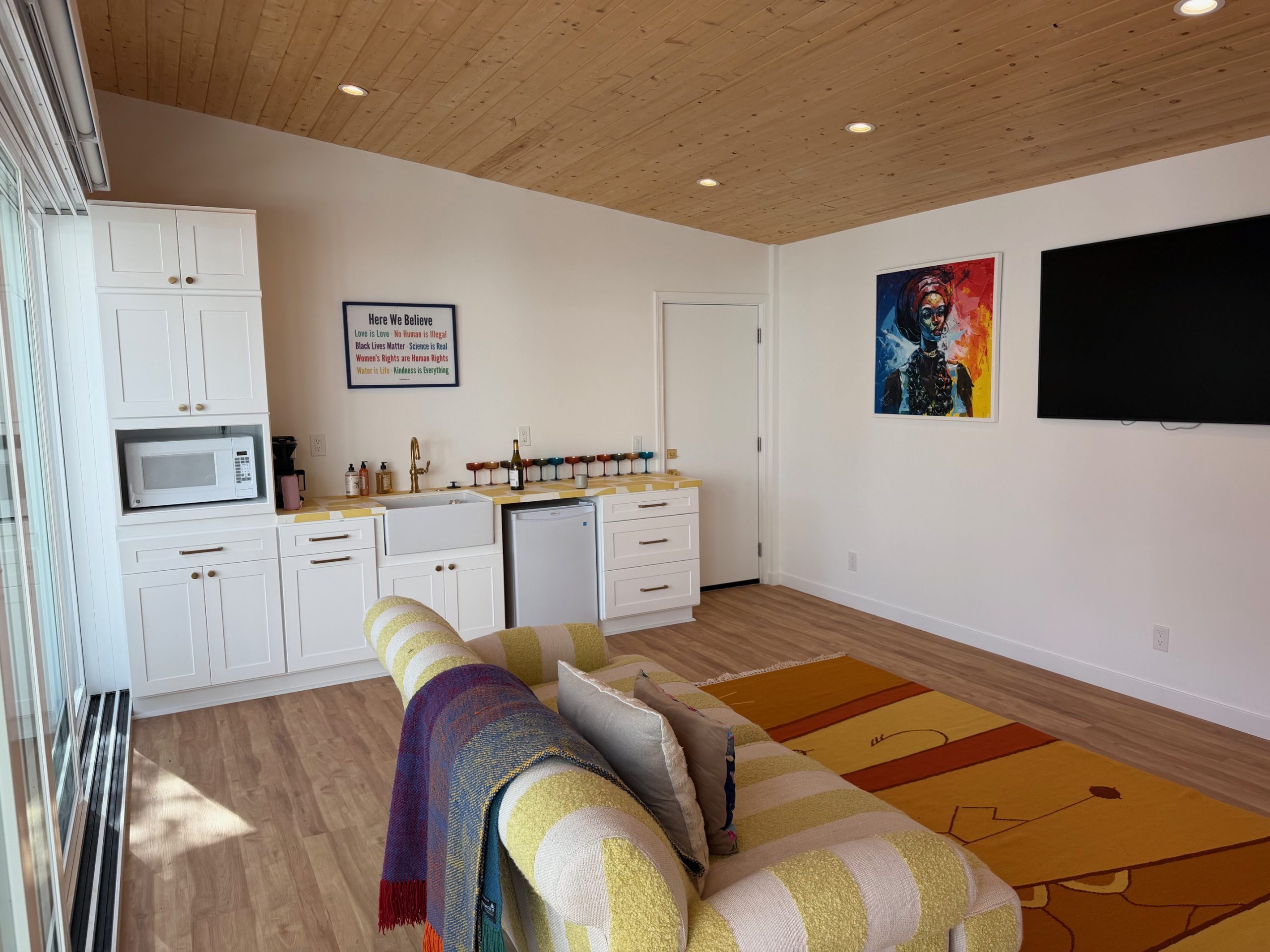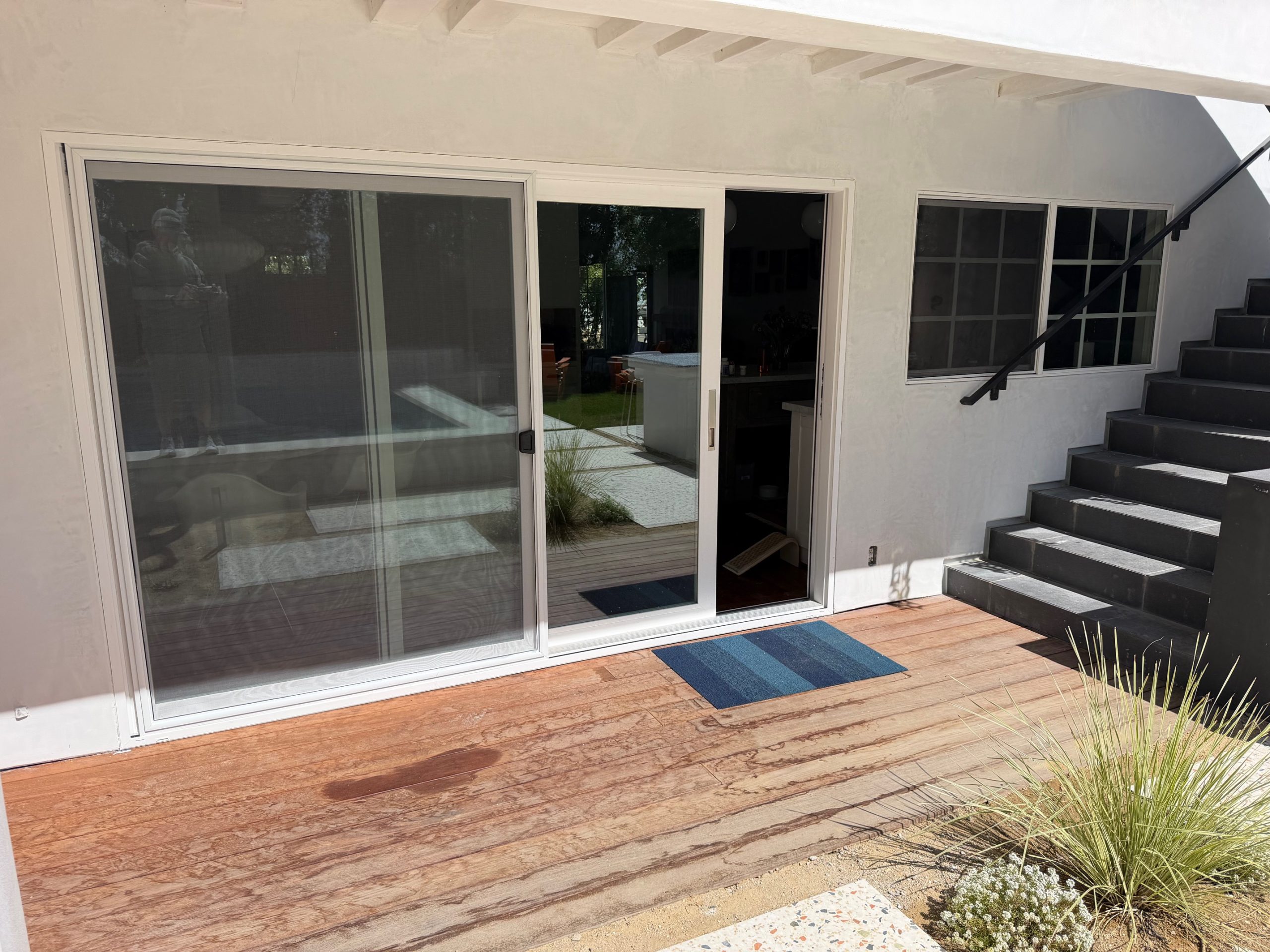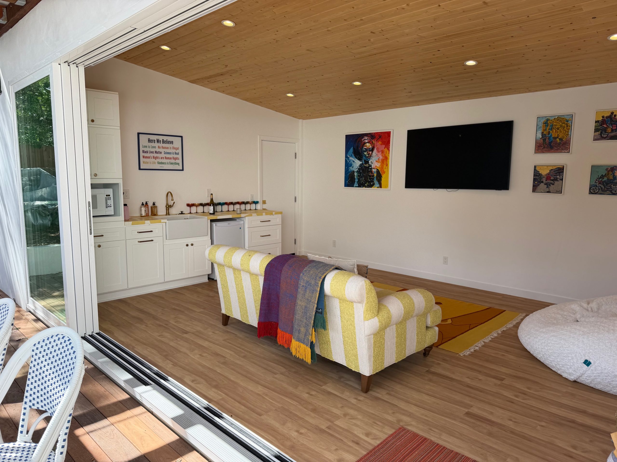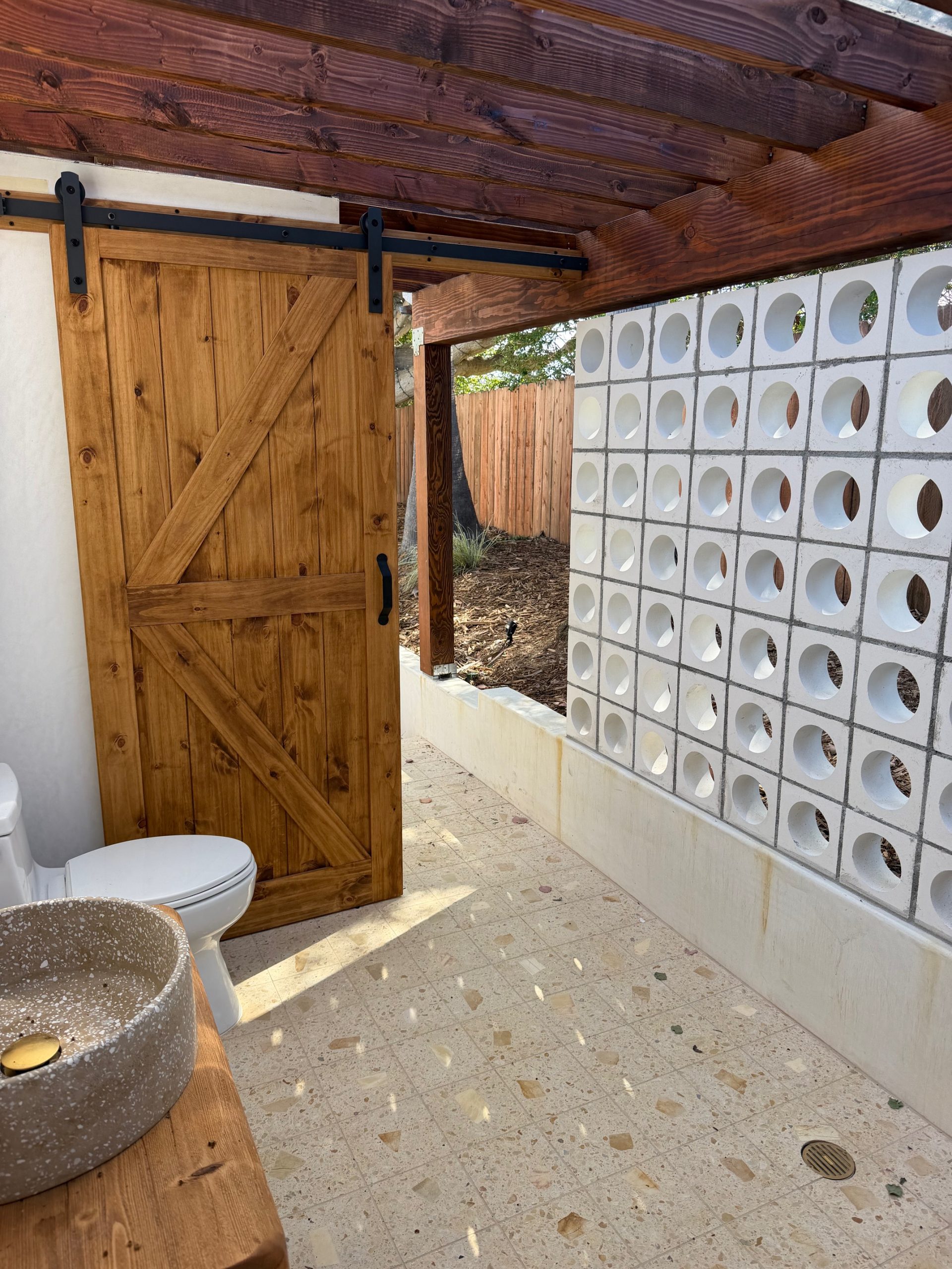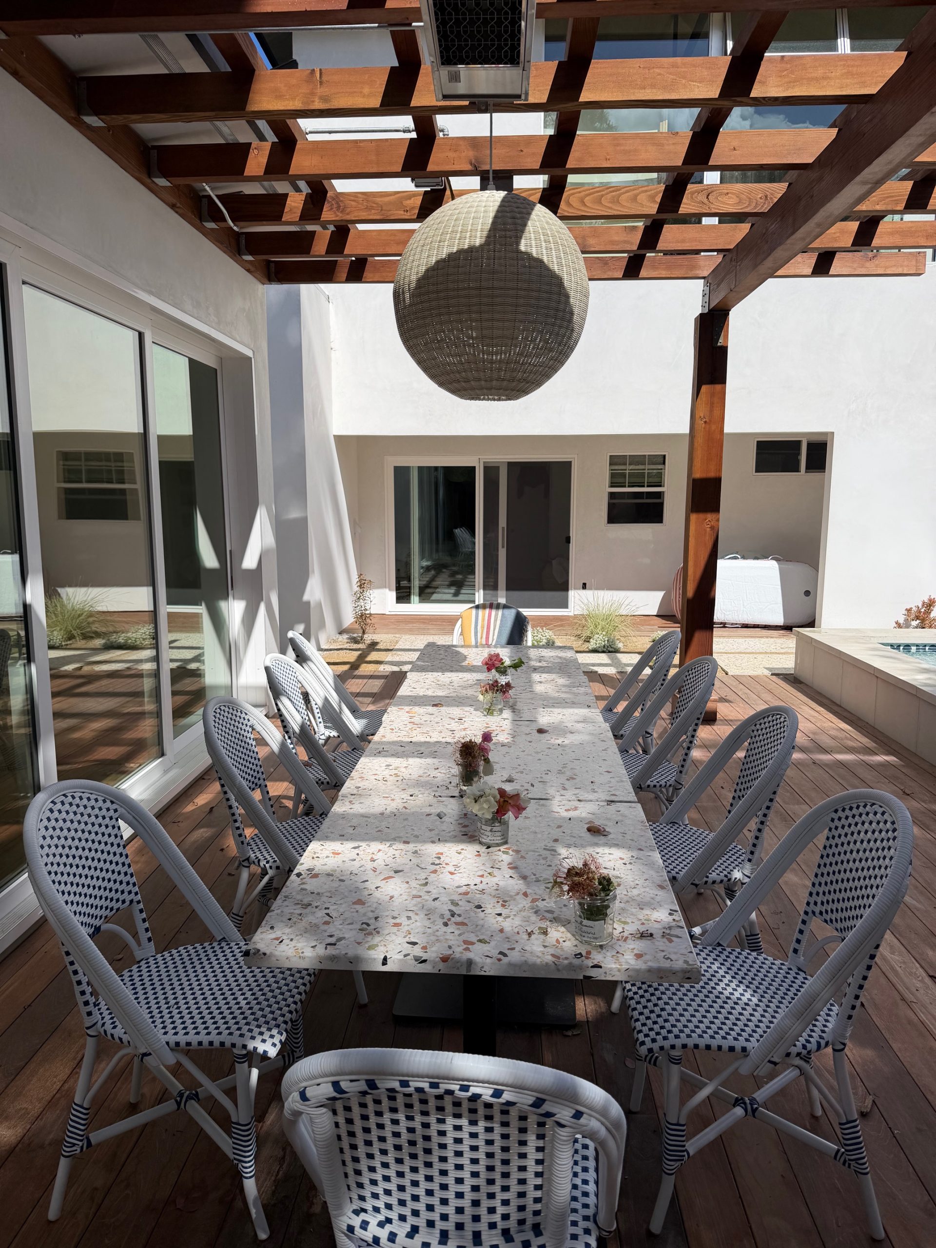 We remodeled this backyard with a custom pool,spa, and ADU that serves as a poolhouse. The clients were in process of pulling a permit for a 350 sq ft second story addition and also wanted a pool and spa. We recommended building a 350 sq ft ADU with an outdoor bathroom and shower which would save them money and be less intrusive to their living area. We also built an island for the existing BBQ for more entertaining areas. Due to the large sliding glass door on the ADU and the lack of light coming into the home facing the pool and ADU, we replaced french doors with new larger sliding glass doors.